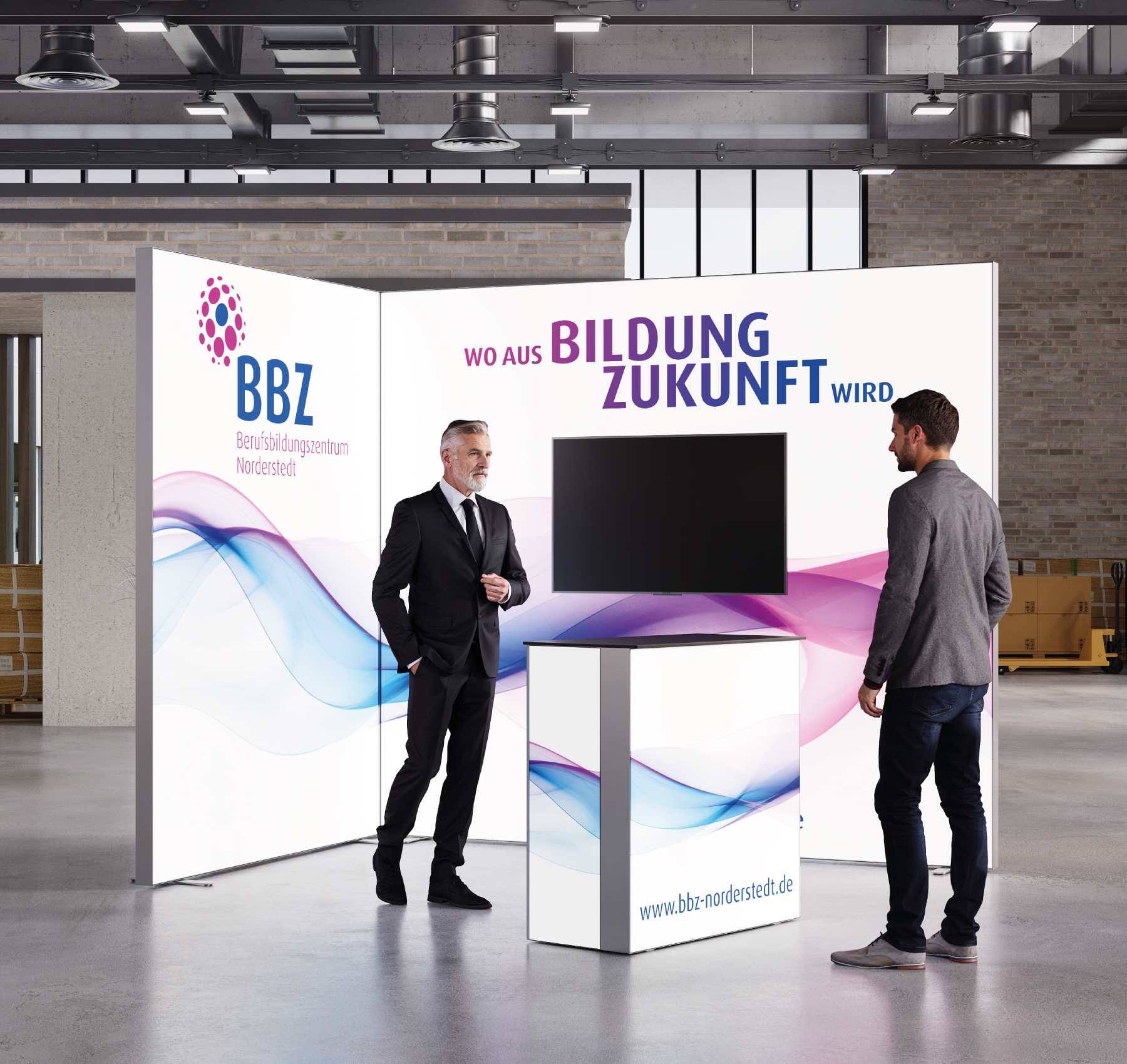 Neben der leuchtenden Werbefläche bietet der Messestand zusätzliche Erweiterungsmöglichkeiten. Eine TV-Halterung für Monitore ermöglicht es, Videos oder interaktive Inhalte in Ihre Präsentation zu integrieren, was Ihre Marke noch ansprechender macht. Der BIG LEDUP Counter One, der sich perfekt in das Gesamtkonzept einfügt, dient als stilvolle Empfangstheke für Kundengespräche und Produktpräsentationen. Einfache Montage und Transport