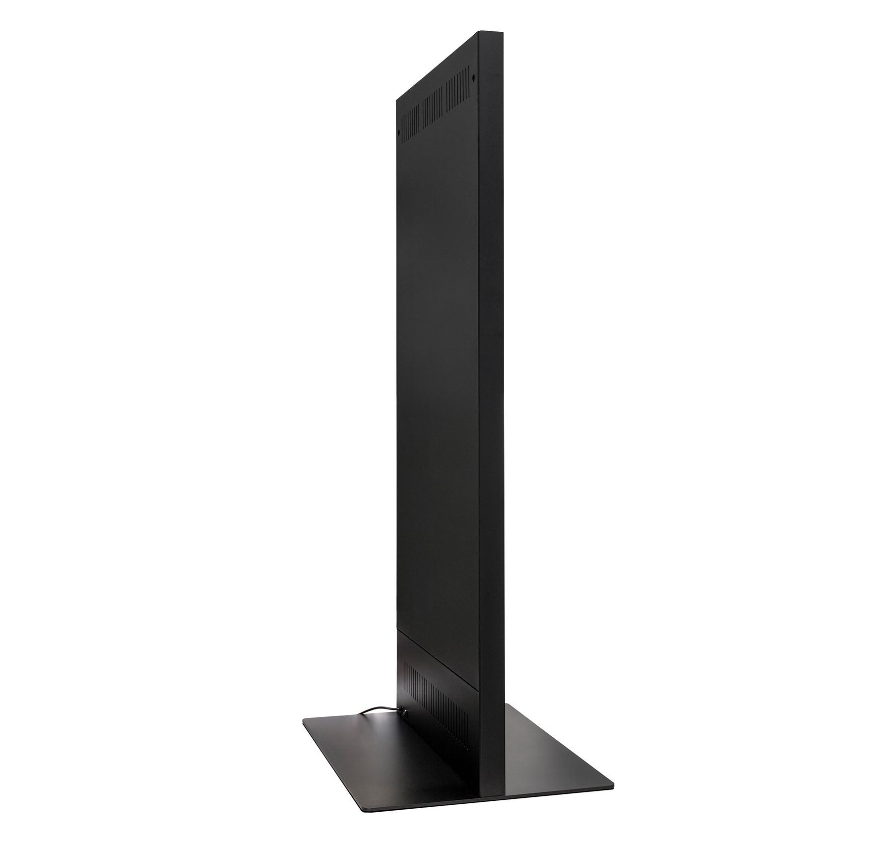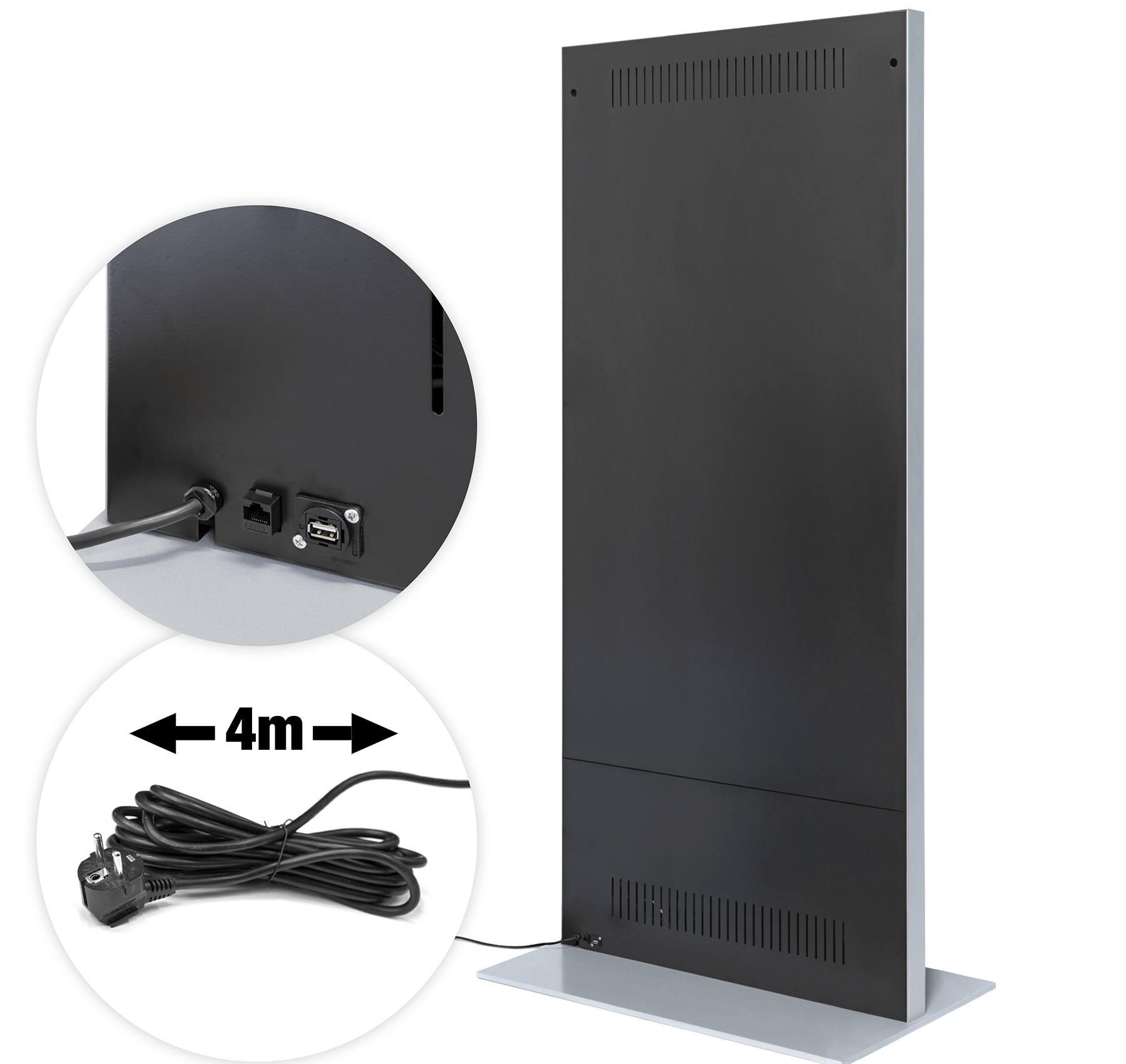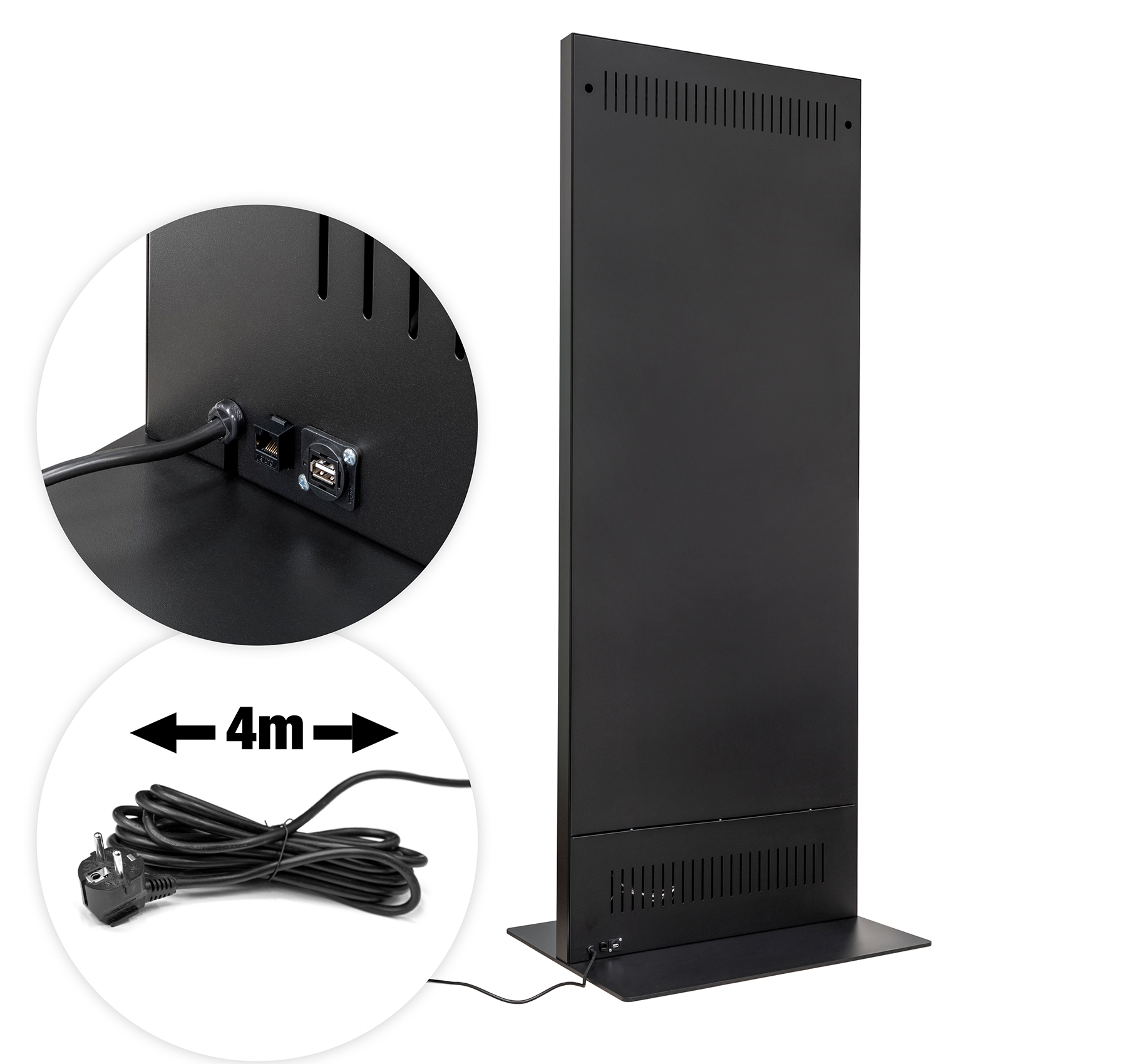 Bei der Variante mit 43″ beträgt das Gehäuse z. B. ca. 719 mm Breite × 2020 mm Höhe × 500 mm Tiefe bei einem Gewicht von ca. 85 kg. Die Leistungsaufnahme liegt bei etwa 121 W. Je nach Größe und Ausstattung variieren Maße und Gewicht entsprechend. Die geringe Tiefe von nur etwa 70 mm gestaltet das Totem elegant und unaufdringlich – ideal für moderne Innenräume.