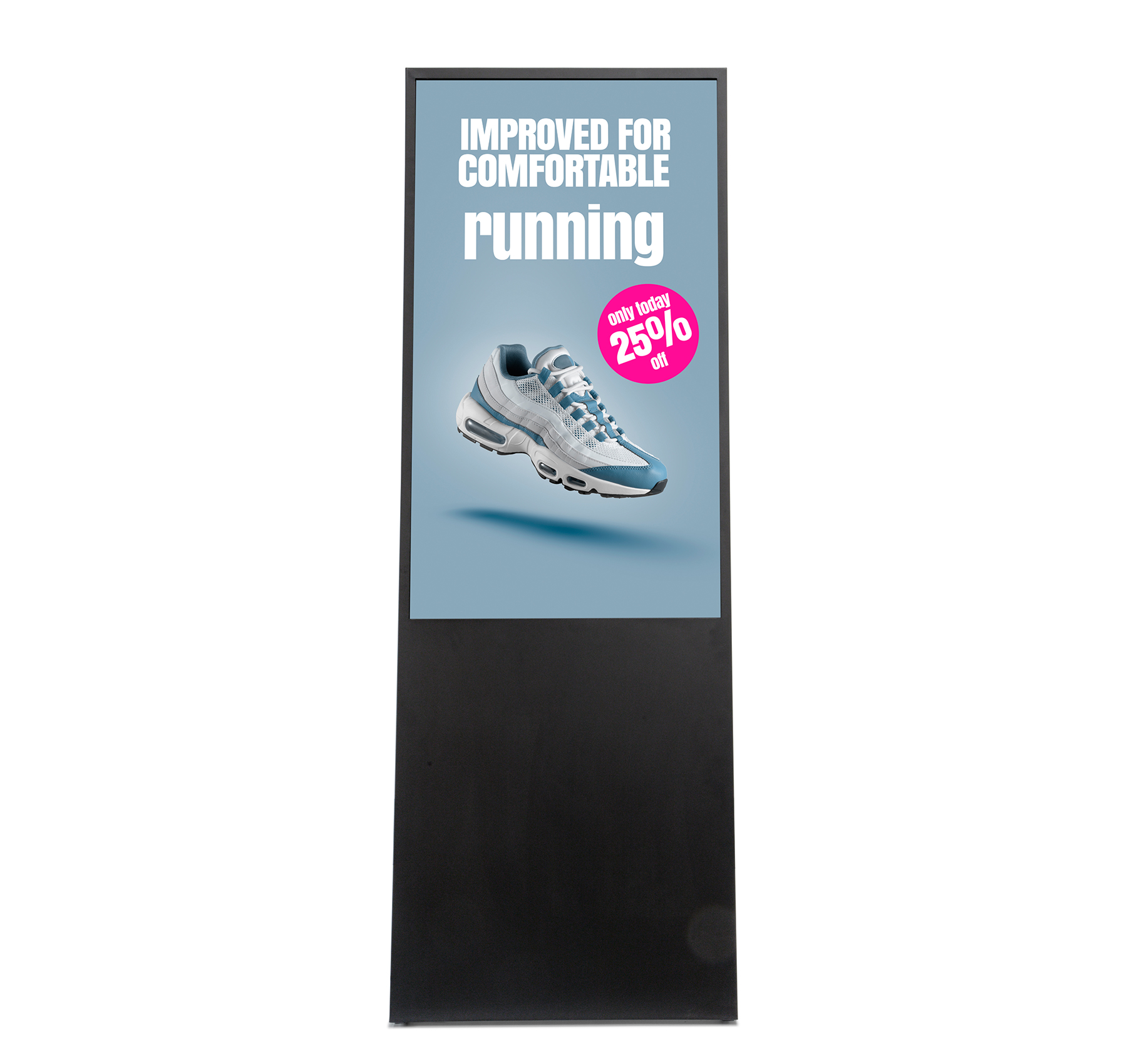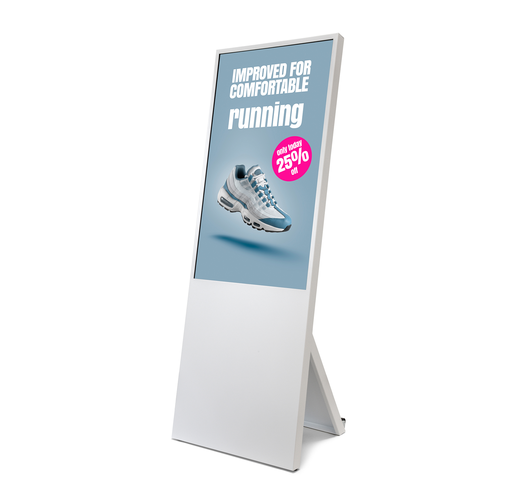 Der stabile, breit ausgelegte Standfuß garantiert sicheren Halt, selbst in stärker frequentierten Bereichen. Mit seiner klaren Linienführung und der robusten Verarbeitung eignet sich der digitale Kundenstopper ebenso für dauerhafte Installationen wie für flexibel wechselnde Einsatzorte. Die großzügige Sichtfläche von 529,2 × 940 mm sorgt dafür, dass Inhalte klar, präsent und aufmerksamkeitsstark dargestellt werden.
