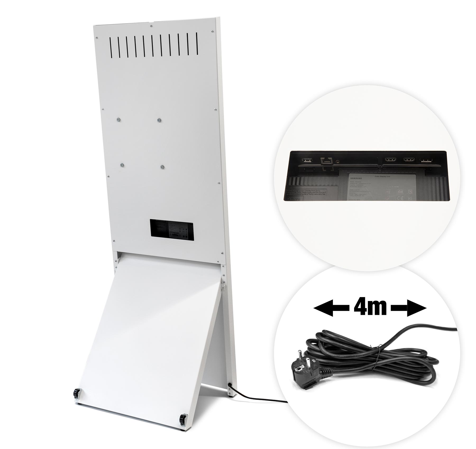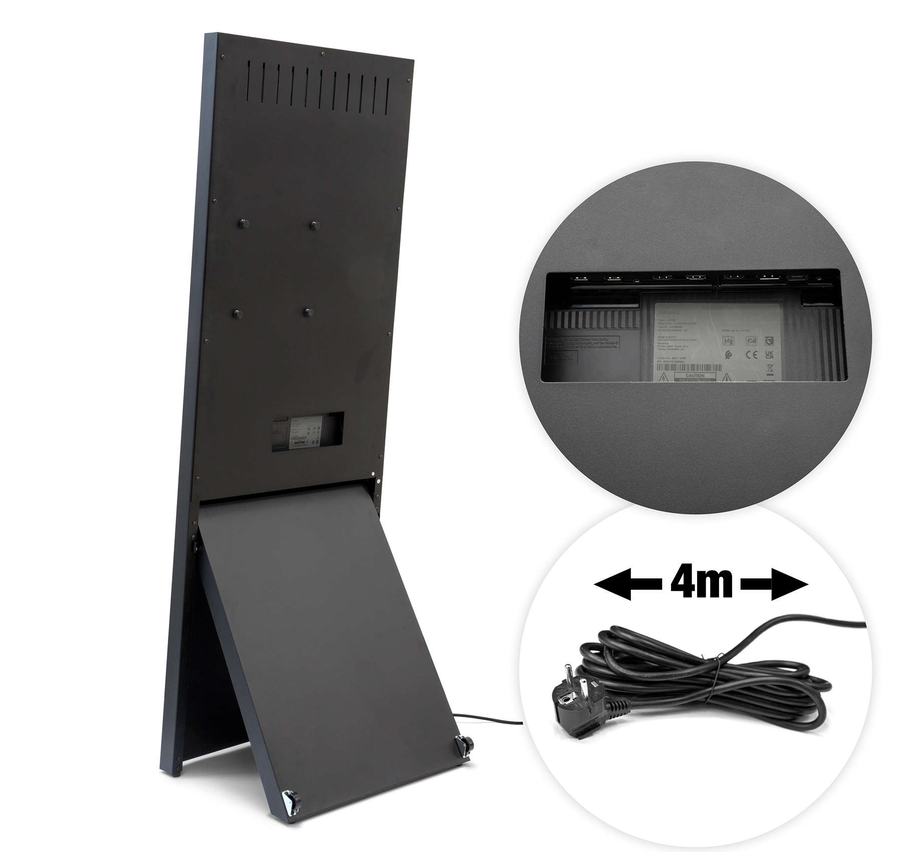 Mit einer Breite von 564 mm, einer Tiefe von 461 mm und einer Höhe von 1.587 mm ist der Kundenstopper großzügig dimensioniert, bleibt aber gleichzeitig flexibel genug, um unkompliziert neu positioniert zu werden. Das Gewicht von ca. 23,45 kg sorgt für Stabilität, ohne die Handhabung zu erschweren. Die Kombination aus moderner Samsung-Displaytechnik, elegantem Design und komfortabler Bedienung macht den Digitalen Kundenstopper Spectrum zu einer optimalen Lösung für hochwertige Indoor-Werbung.