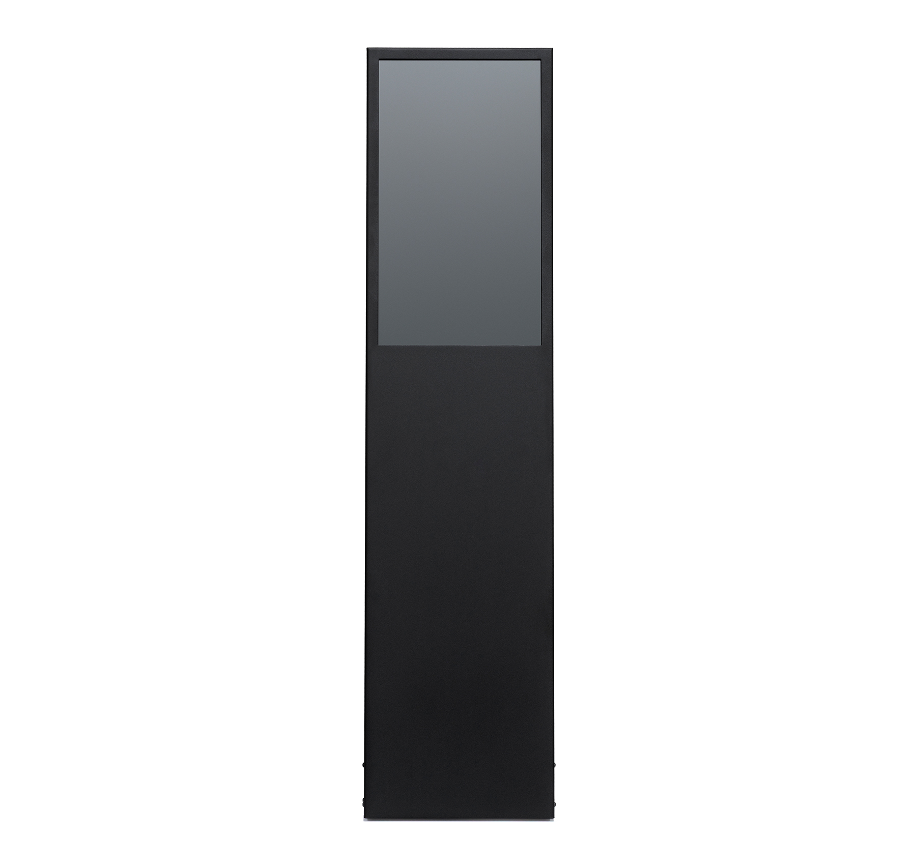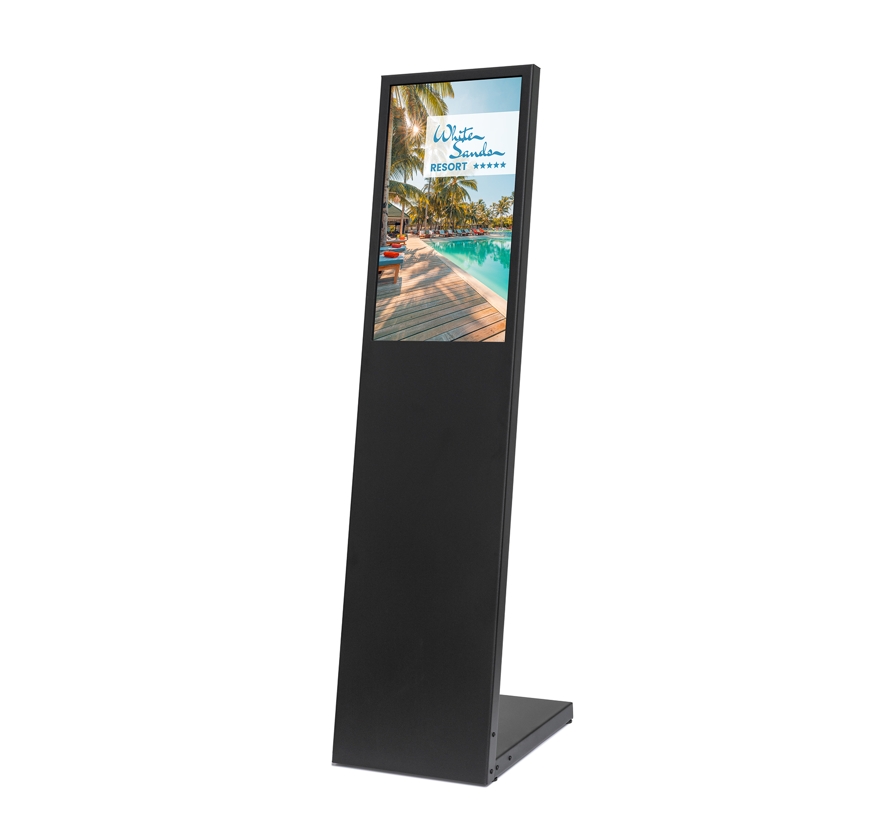 Die Konstruktion überzeugt durch eine pulverbeschichtete Oberfläche in Schwarz, die resistent gegen Fingerabdrücke ist – ideal für frequentierte Einsatzorte. Die Basis ist abnehmbar, wodurch der Stand einfach transportiert oder montiert werden kann. Inhalte lassen sich über USB-Stick, WiFi oder Fernbedienung einspeisen – ideal für schnelle Kampagnenwechsel oder dynamische Informationsdarstellungen.