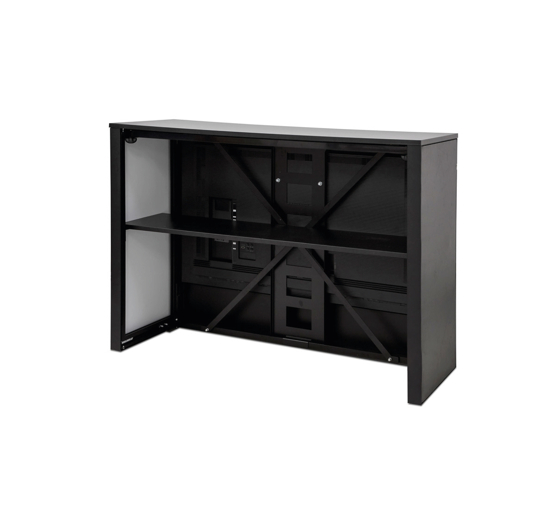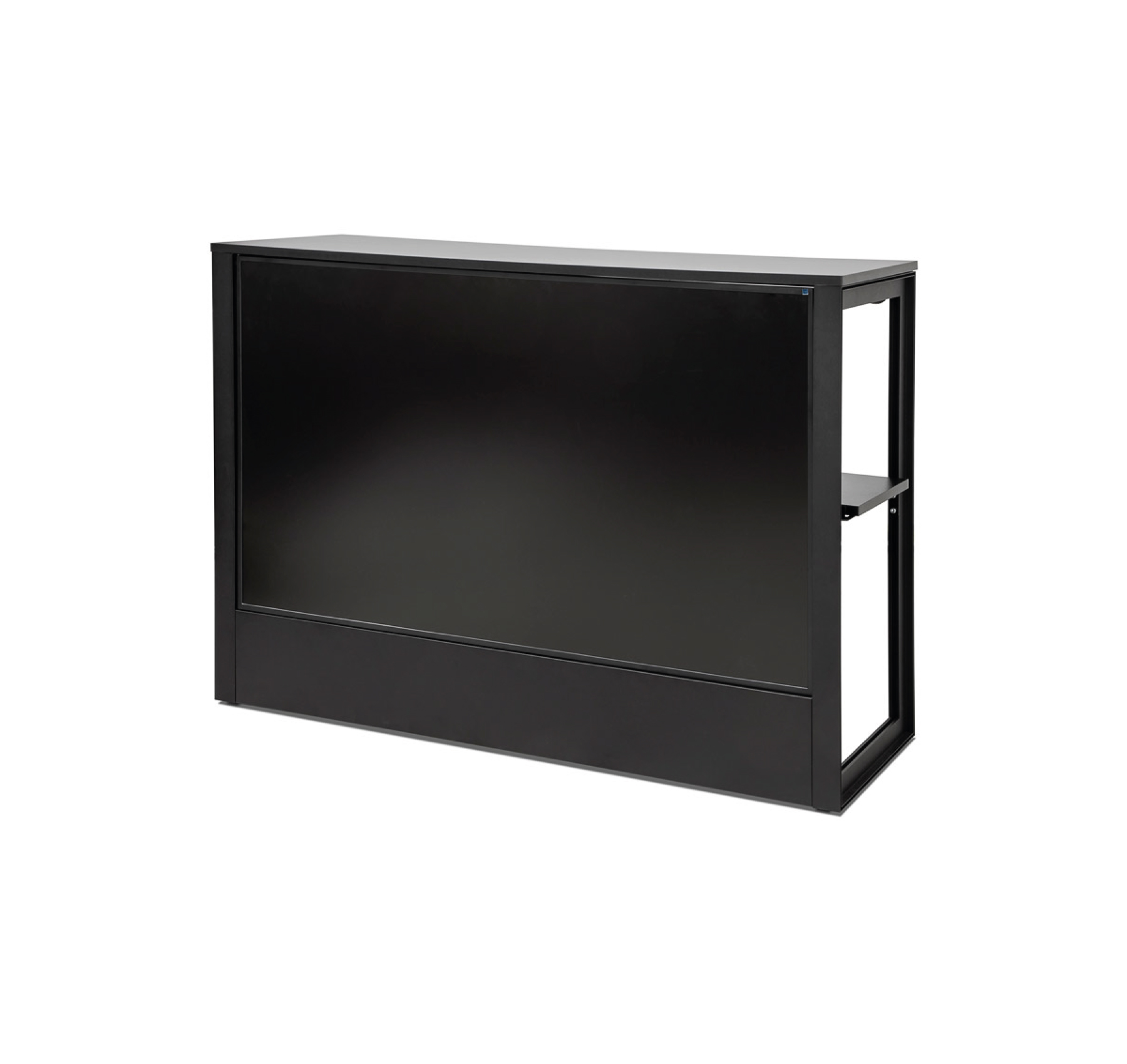 Durch die Kombination aus Präsentationsfläche und Stauraum erfüllt die Theke mehrere Funktionen gleichzeitig. Im Inneren befindet sich eine praktische Ablage für Prospekte, Werbematerial oder persönliche Gegenstände. Dadurch bleibt Ihr Stand stets ordentlich und professionell.