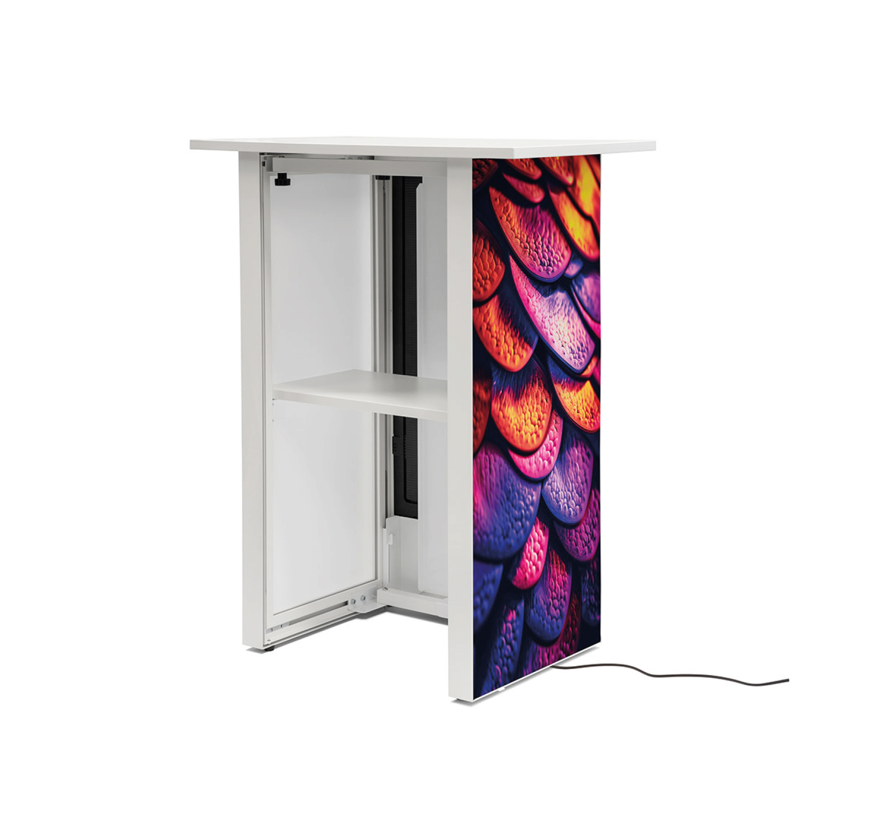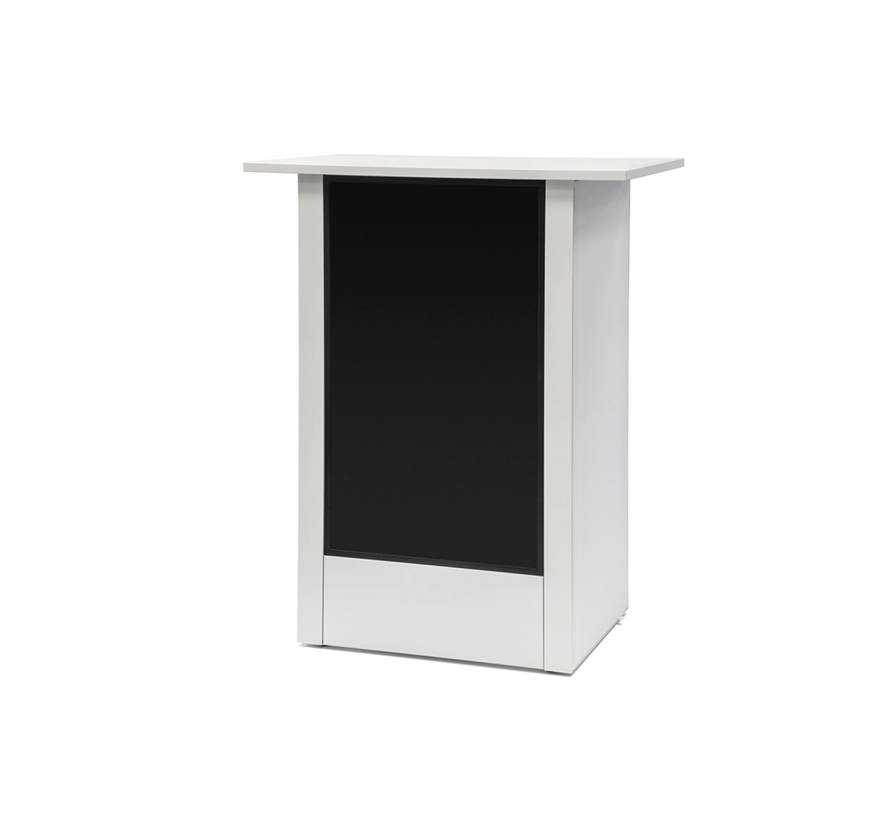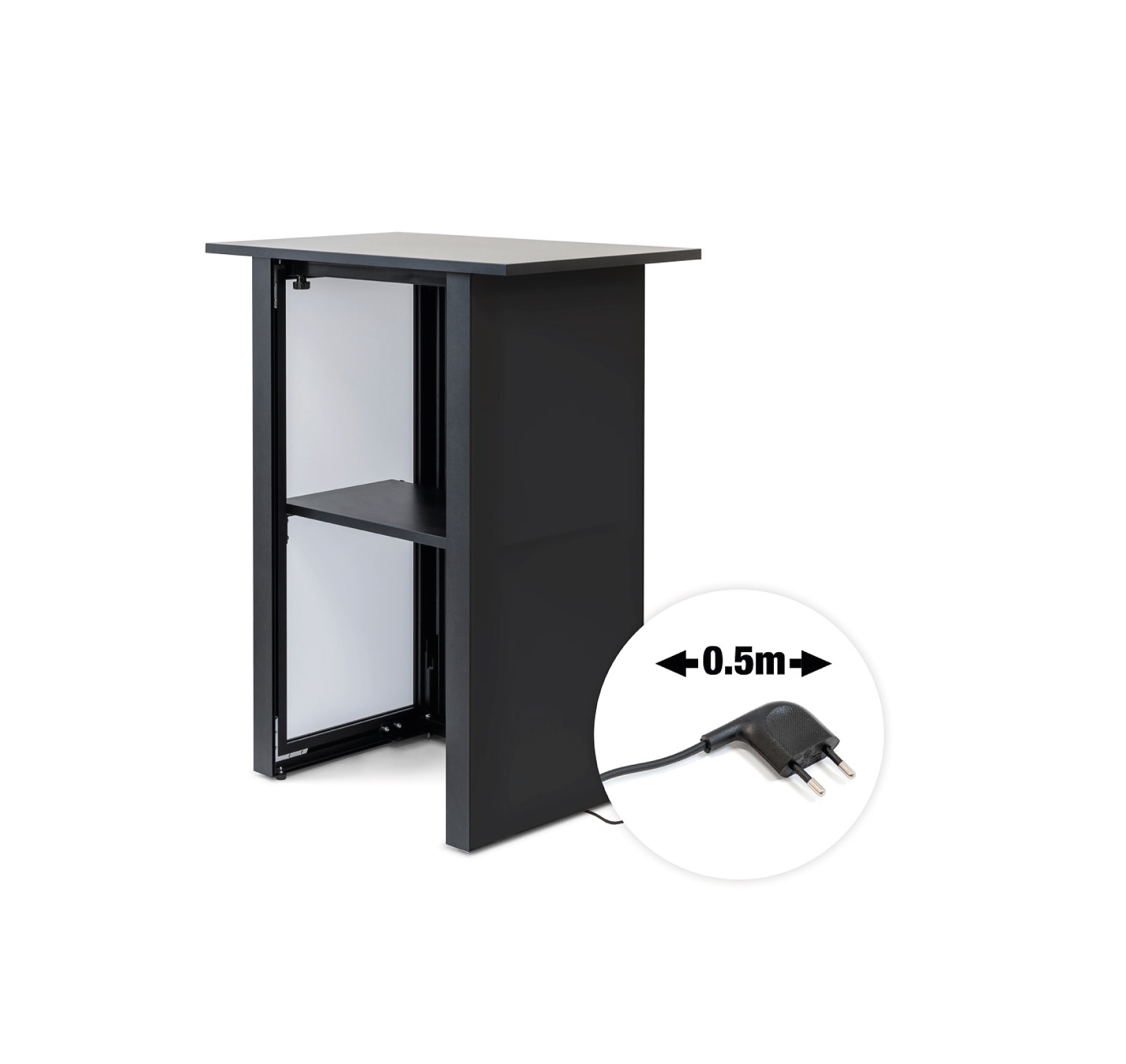 Durch ihre kompakte Bauweise ist sie besonders platzsparend und flexibel einsetzbar. Gleichzeitig bietet sie eine praktische Arbeitsfläche sowie integrierten Stauraum im Inneren für Prospekte, Werbematerial oder persönliche Gegenstände.