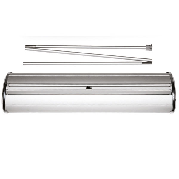 Das Roll-Up Display Double ist in der Höhe verstellbar für maximale Anpassungsfähigkeit. Standardmäßig misst es 200 cm, aber mit der optionalen Verlängerungsstange kann es auf 220 cm erweitert werden. Diese Stange lässt sich problemlos anbringen und ist in Schwarz oder Silber erhältlich, passend zur Kassette Ihrer Wahl.