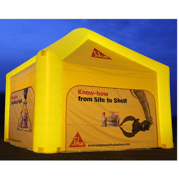 Aufblasbare Zelte sind eine interessante Alternative zu Alu-Zelten. Die Aufblasbaren Zelte sind aus Polyestergewebe mit einem Flächengewicht von ca. 300 g / m2 hergestellt. Die Zelte können aus einem farbigen Stoff produziert werden, oder Sie können auch 100% bedruckt werden. Die Grafik wird durch Sublimation, Solvent oder Siebdruck aufgetragen. Optional lassen sich die Zeltwände mit Fenstern oder Türen wählen. Das pneumatische Zelt enthält ein komplettes Zubehör für den Einsatz: Hammer, Einbaugebläse, Bedienungsanleitung, Abspannseile. |