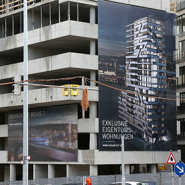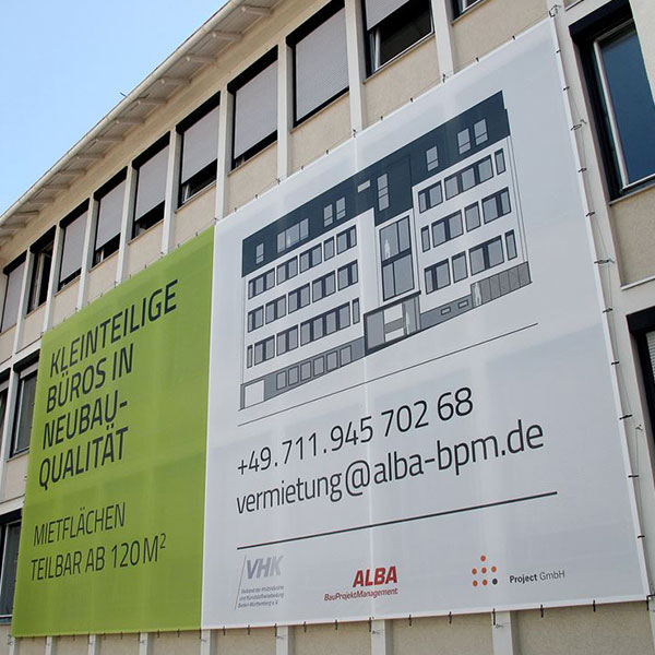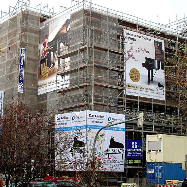Fassadenwerbung lässt sich vielseitig einsetzen und ist besonders im Außenbereich angesagt und vor allem wirkungsvoll. Der Klassiker sind Hausfassaden von normalen Gebäuden, aber auch Baustellen. Hier kann die Fassadenwerbung mittels Ösen, Hohlsäumen und Rundkedern sicher befestigt werden. Sie haben aber auch die Möglichkeit, Werbebanner an Bauzäunen anbringen zu lassen.