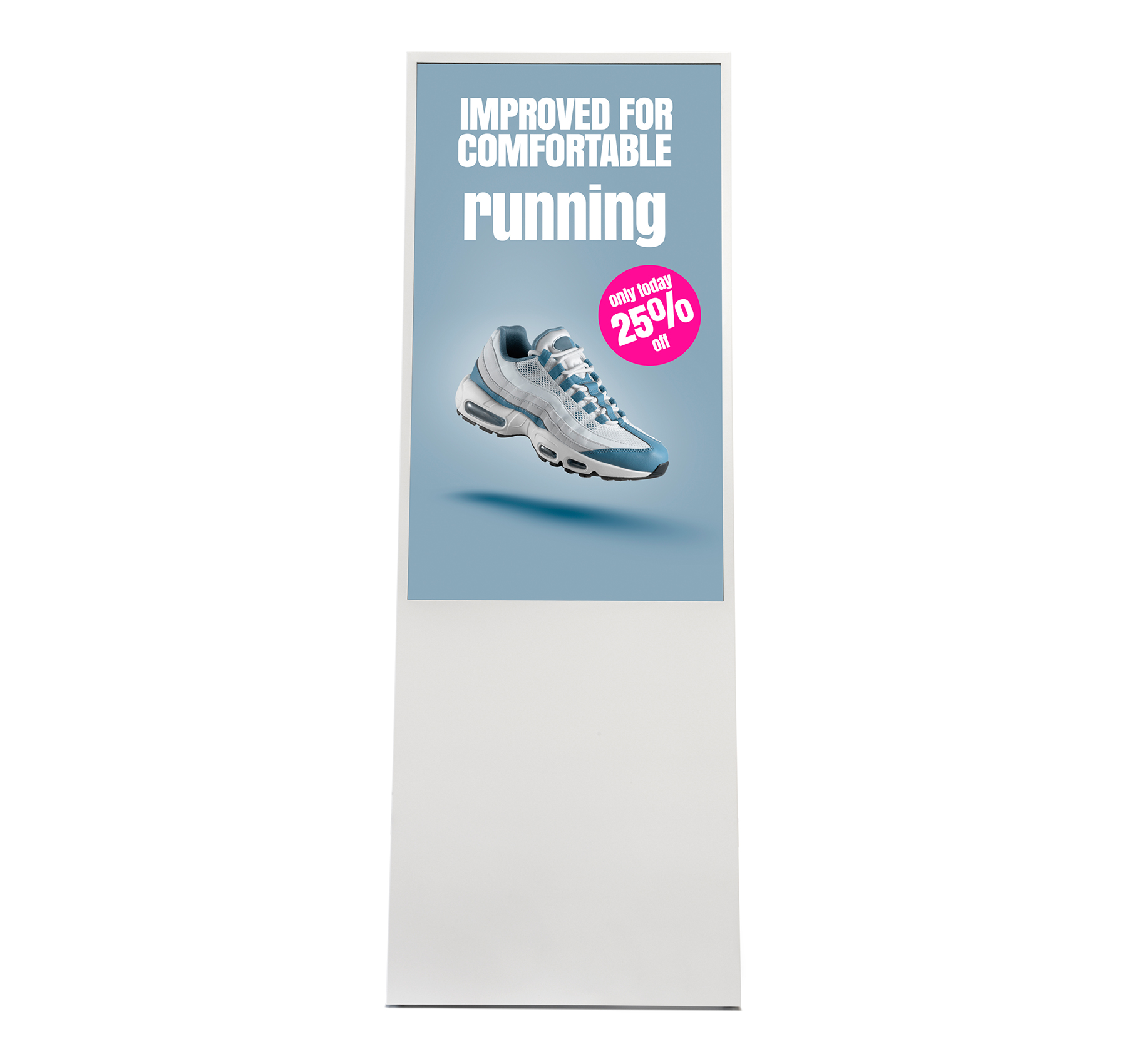 Der stabile, breit ausgelegte Standfuß garantiert sicheren Halt, selbst in stärker frequentierten Bereichen. Mit seiner klaren Linienführung und der robusten Verarbeitung eignet sich der digitale Kundenstopper ebenso für dauerhafte Installationen wie für flexibel wechselnde Einsatzorte. Die großzügige Sichtfläche von 529,2 × 940 mm sorgt dafür, dass Inhalte klar, präsent und aufmerksamkeitsstark dargestellt werden.