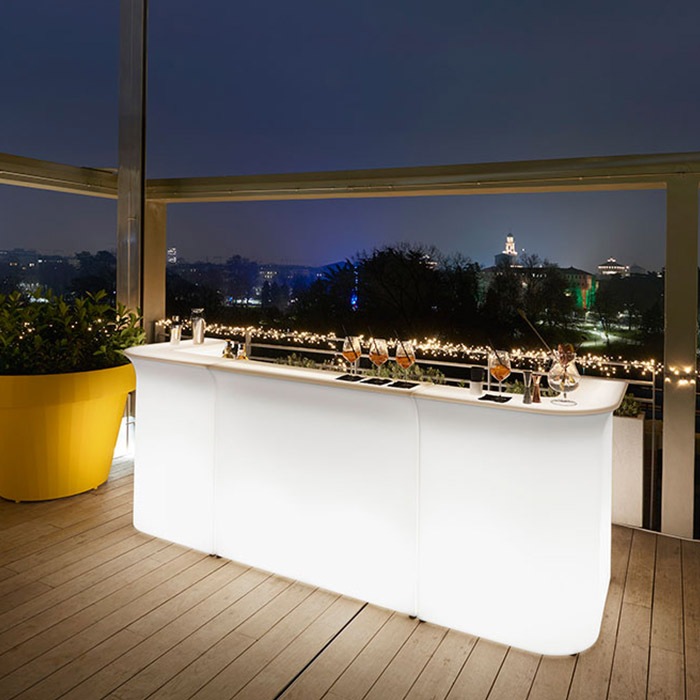 Die Break Line Theke ist eine leuchtende Bartheke, die zur Familie Slide gehört. Break Line ist eine helle, minimalistische und vielseitige Theke, die innen und außen, kleine Bereiche und große Gärten beleuchtet. Die Theke ist widerstandsfähig und leicht zu reinigen. Es ist die ideale Lösung für Verträge und Veranstaltungen. Es ist möglich, Break Line mit etwas Zubehör wie einem Speed-Rack und einer Cocktailstation zu komplettieren.